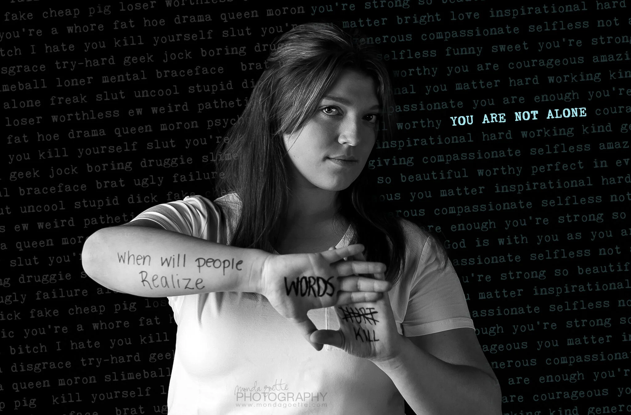 I had it in my mind right away to have the images be black and white to be more effective - because as an artist, black and white brings a whole different element of emotion and expression. I wanted this shoot to make bold statements about how the team feels both personally and in general about bullying in today's world. I also envisioned a message of encouragement to be tied in with this photo shoot that might encourage others to see that as much as words hurt, they can also help carry us through hard times as well.
