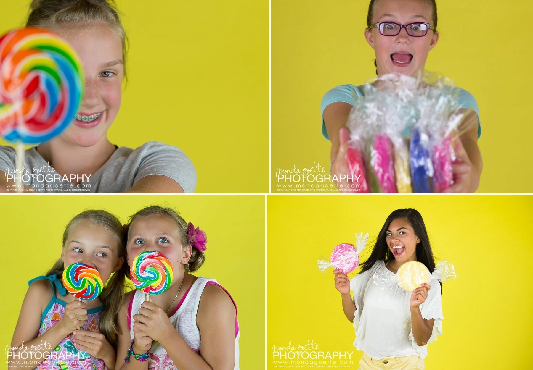 Our latest fun photo session from the Girls of Summer: I AM ME project was themed "Candyland." The session came at the perfect time for my garage studio set up in Burnsville. I needed some fun and bright cheery, sweet smiles from the girls this day, and they brought smiles ear-to-ear! With a bright yellow backdrop, and gigantic candy props, we created our own sugar surge! Watch the preview video with candy coated goodness!
