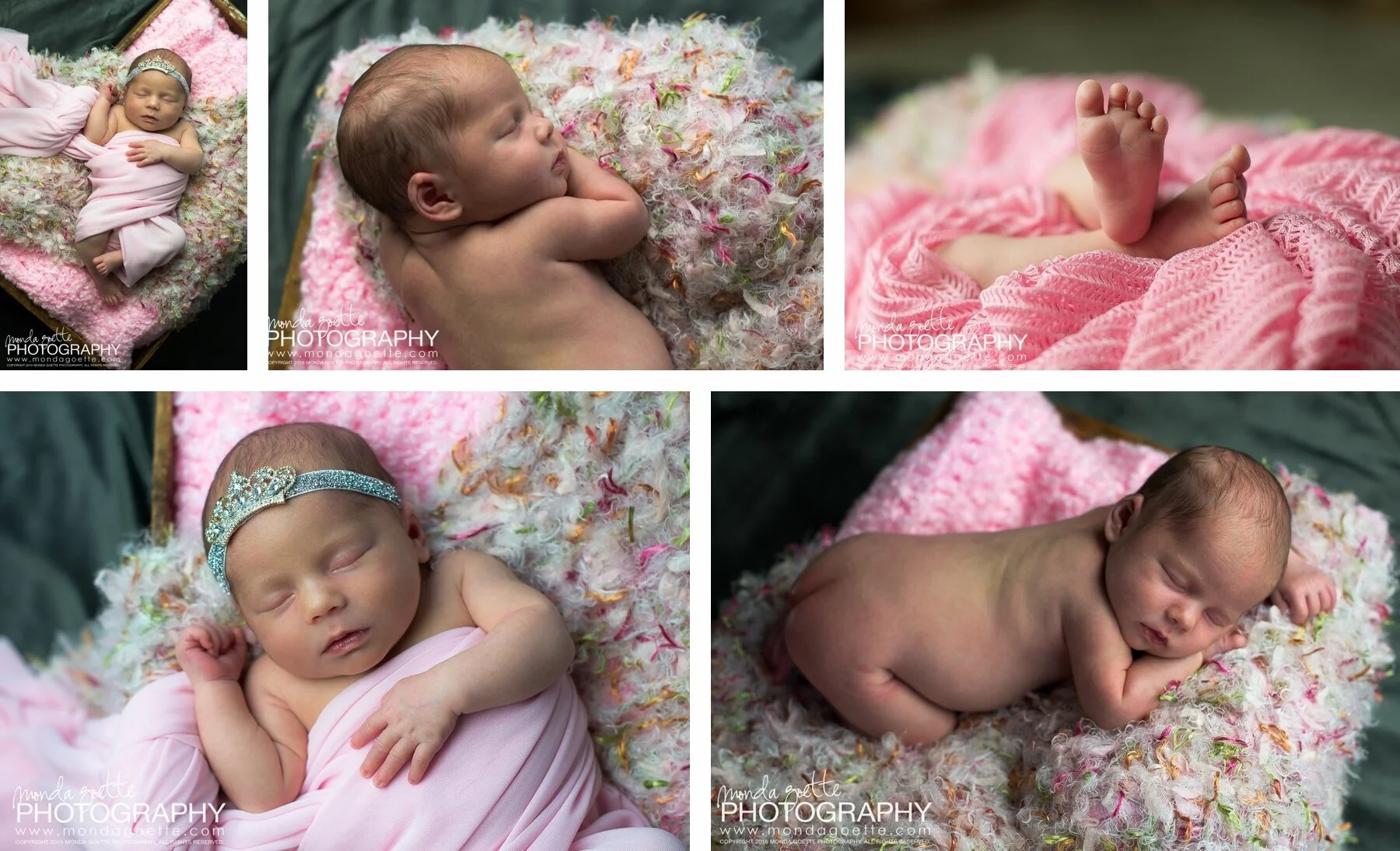 This little sweetheart slept through most all of her session with me...except for when I put a pearl necklace on her. Baby didn't like that one bit! With the exception of the pearls, not a peep from her!